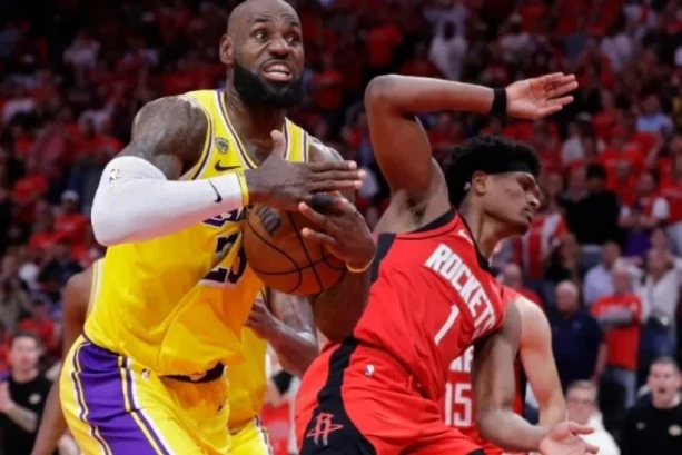 Кошаркарите на Лос Анџелес Лејкерс, поредводени од Леброн Џејмс, славеа во Хјустон и сега една победа ги дели од пласман во конференциското полуфинале. Изминатата ноќ во НА плејофот, ри брејк направија Сан Антонио и Бостон, на гостувањата во Портланд, односно Филаделфија.