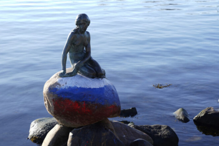 Непознат сторител нацртал руско знаме на камен на кој стои статуа посветена на бајката на Ханс Кристијан Андерсен во пристаништето во Копенхаген.