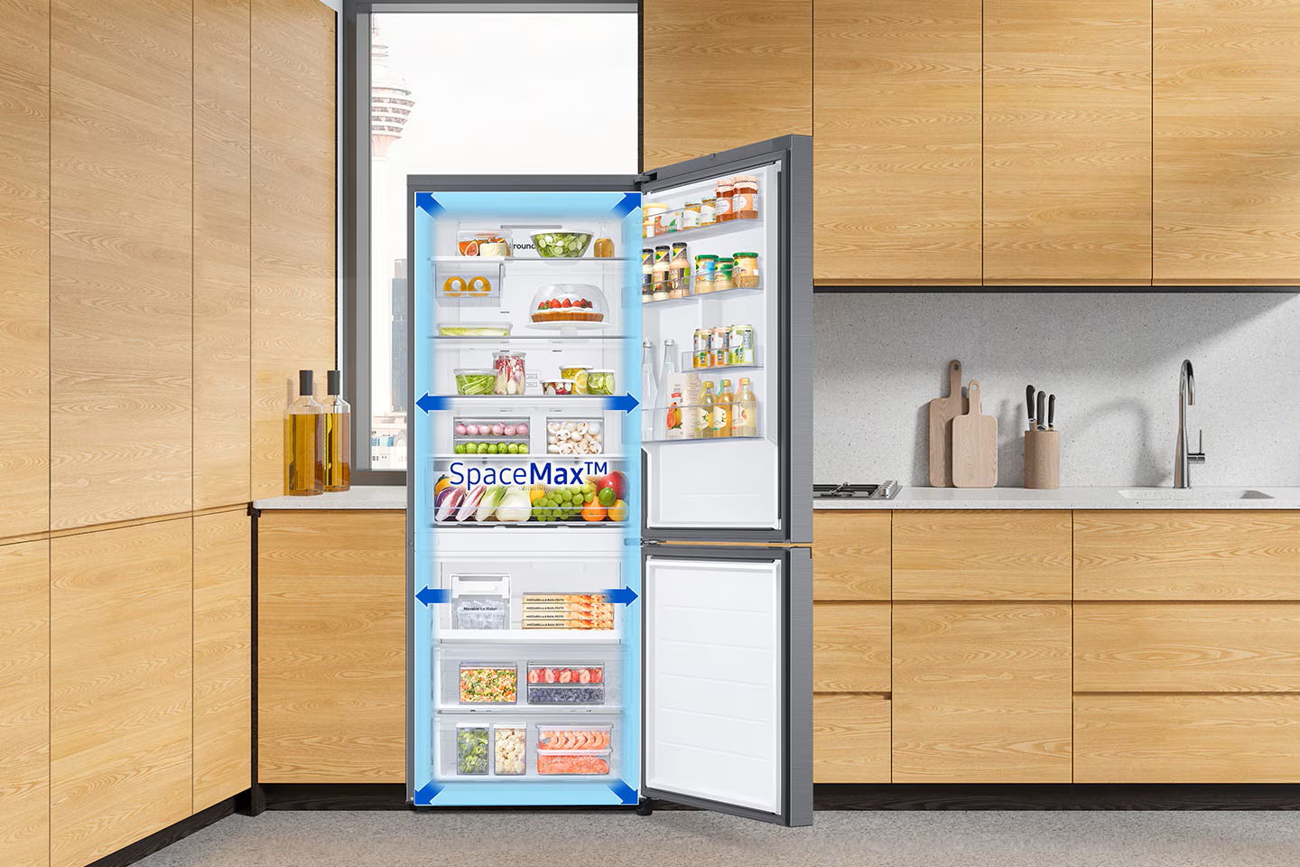 Samsung фрижидерот го претставуваат врвот на технолошките иновации и приспособливиот дизајн. Корисниците можат да избираат помеѓу различни форми и бои за да фрижидерот совршено се вклопи во ентериерот и стилот на нивната кујна и уредувањето воопшто. Еден од новите модели е фрижидерот со замрзнувач RB6000D кој се одликува со иновативен дизајн и многу повеќе простор за складирање храна. Режимот AI Energy Mode во апликацијата SmartThings заштедува до 15% енергија, а покрај тоа што ја одржува храната посвежа подолго време, обезбедува и заштеда на сметката за електрична енергија. Вештачката интелигенција кај овој фрижидер придонесува тој да биде ефикасен и при одмрзнување, регулирајќи ја температурата врз основа на претходните шеми на употреба и условите во околината. Изработен е од најнови материјали, но и покрај тенките ѕидови, тој има совршена изолација со помош на технологијата SpaceMax™.