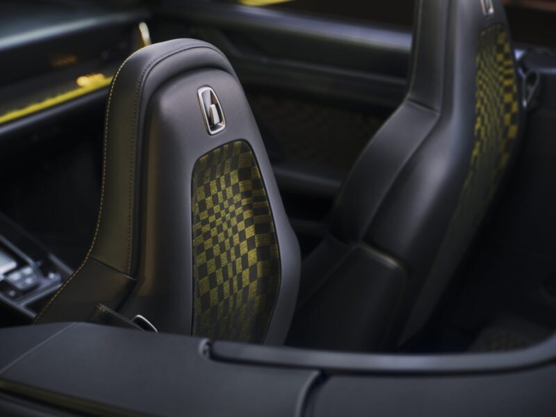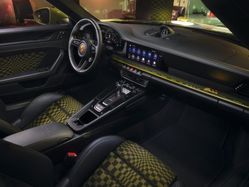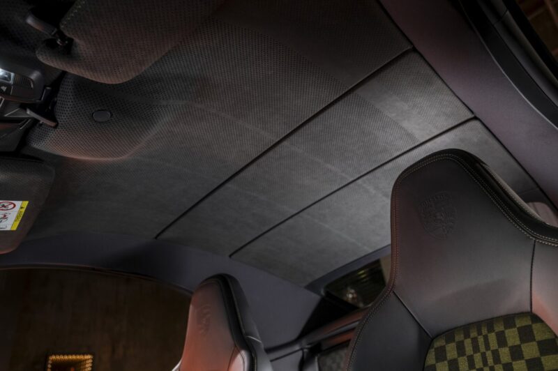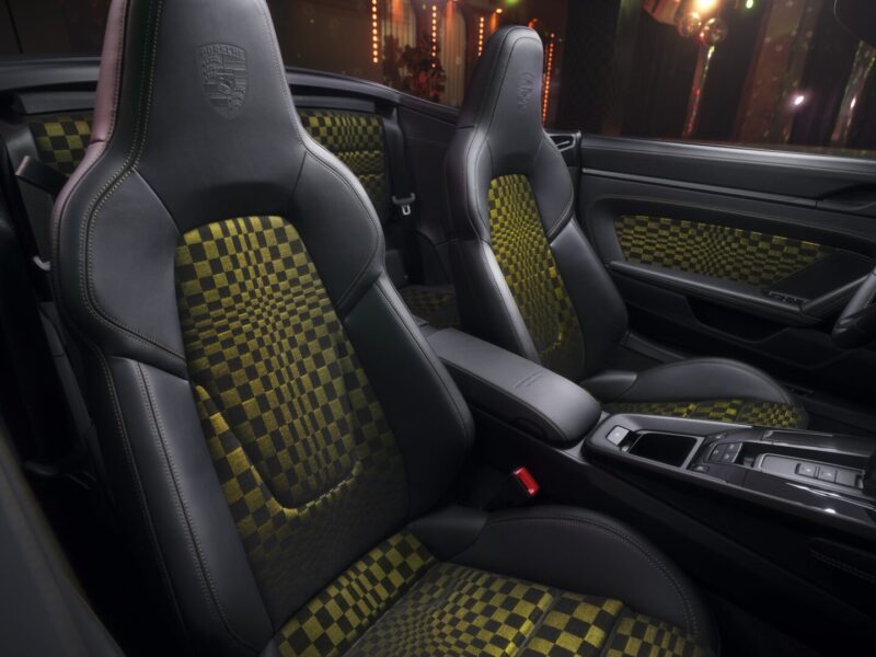 Врвот на ентериерот е иконскиот Pasha дизајн на ткаенина во црно/маслиново нео. Графичкиот дизајн на материјалот потсетува на карирано знаме кое се движи. Различни големини, паметно наредени правоаголници создаваат еден вид движење во шемата. Наместо jacquard velour како во минатото, 911 Spirit 70 комбинира текстил и тн. flock yarns. Ова му дава на материјалот уште поспортски карактер, подобрено чувство и повеќе удобност, особено на подолги патувања.
