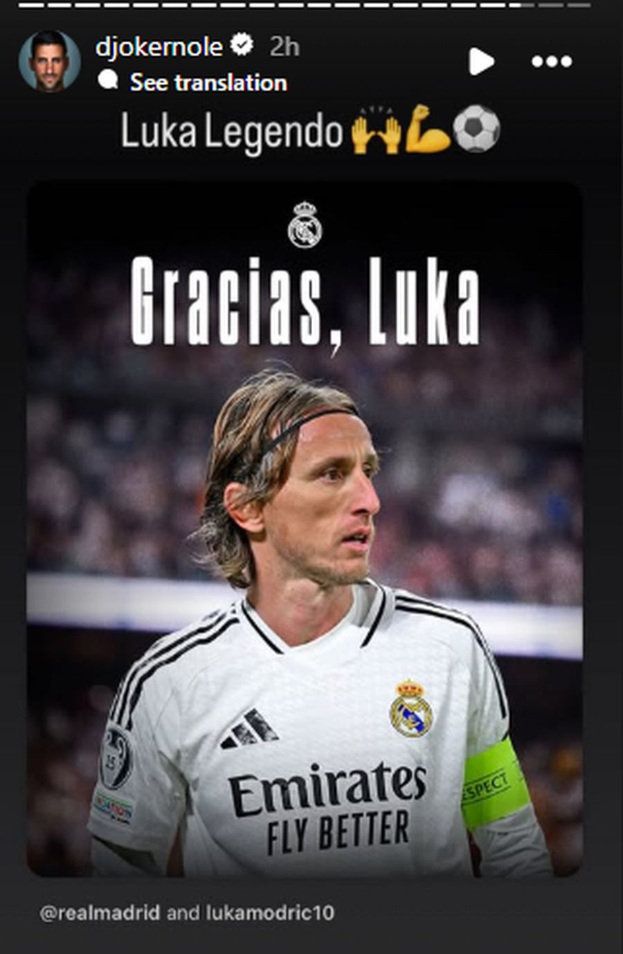 – Лука легендо, – гласи пораката која ја испрати Ѓоковиќ со споделена објава од официјалниот профил на Реал Мадрид.