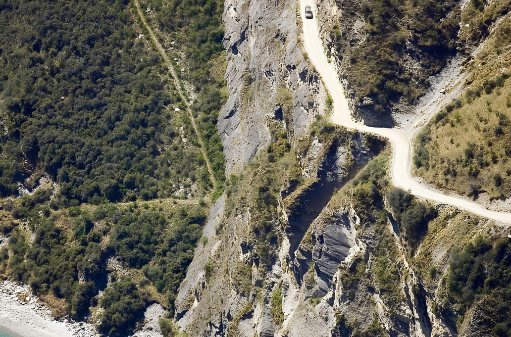 Рачно направен уште во 19. век, овој тесен планински пат покрај реката Шотовер е познат по лизгавата подлога и екстремните падини.