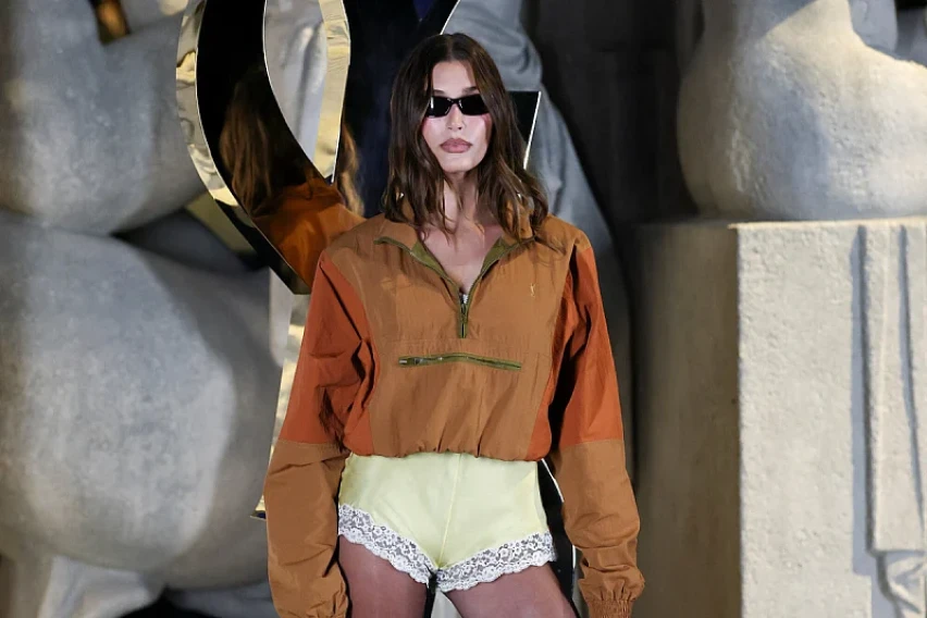 Манекенката Хејли Бибер беше една од ѕвездите кои ја следеле ревијата на Сен Лоран за време на Модната недела во Париз, а се најде во центарот на вниманието благодарение на модното издание кое се состоело од „пижама“ шорцови со тантела, потпетици и бомбер јакна.