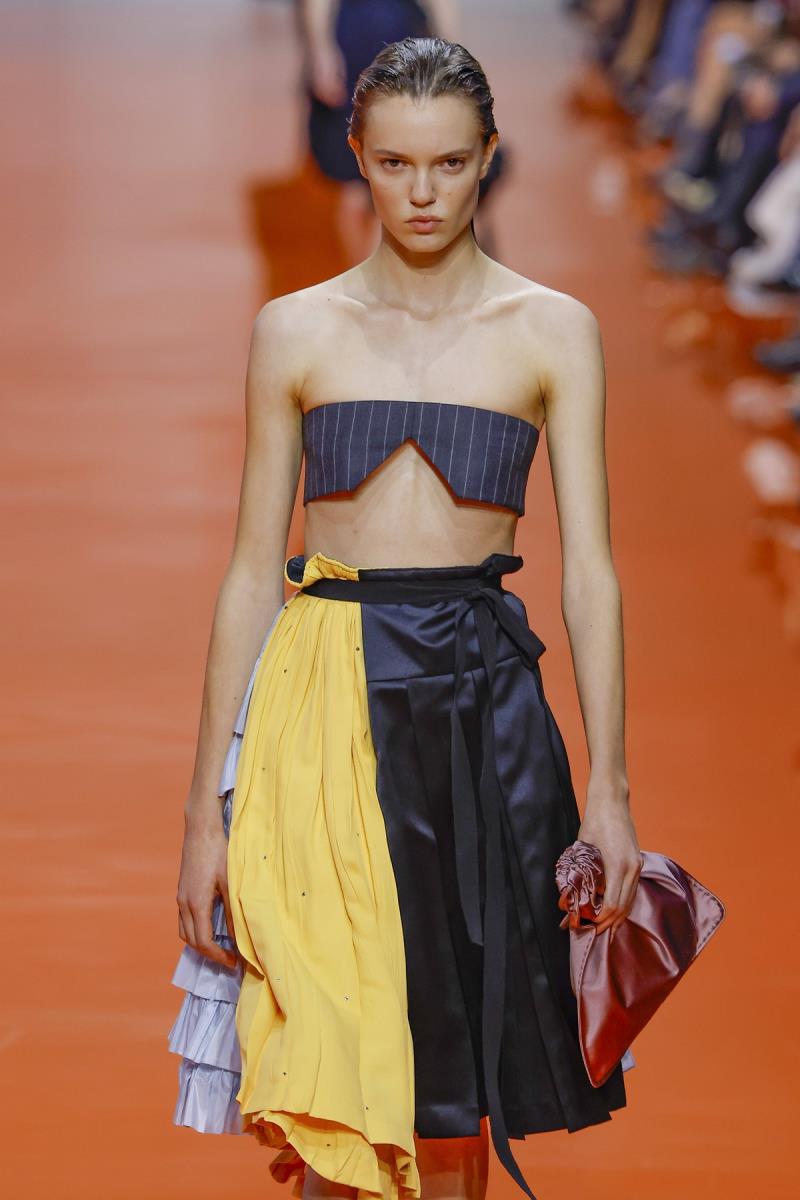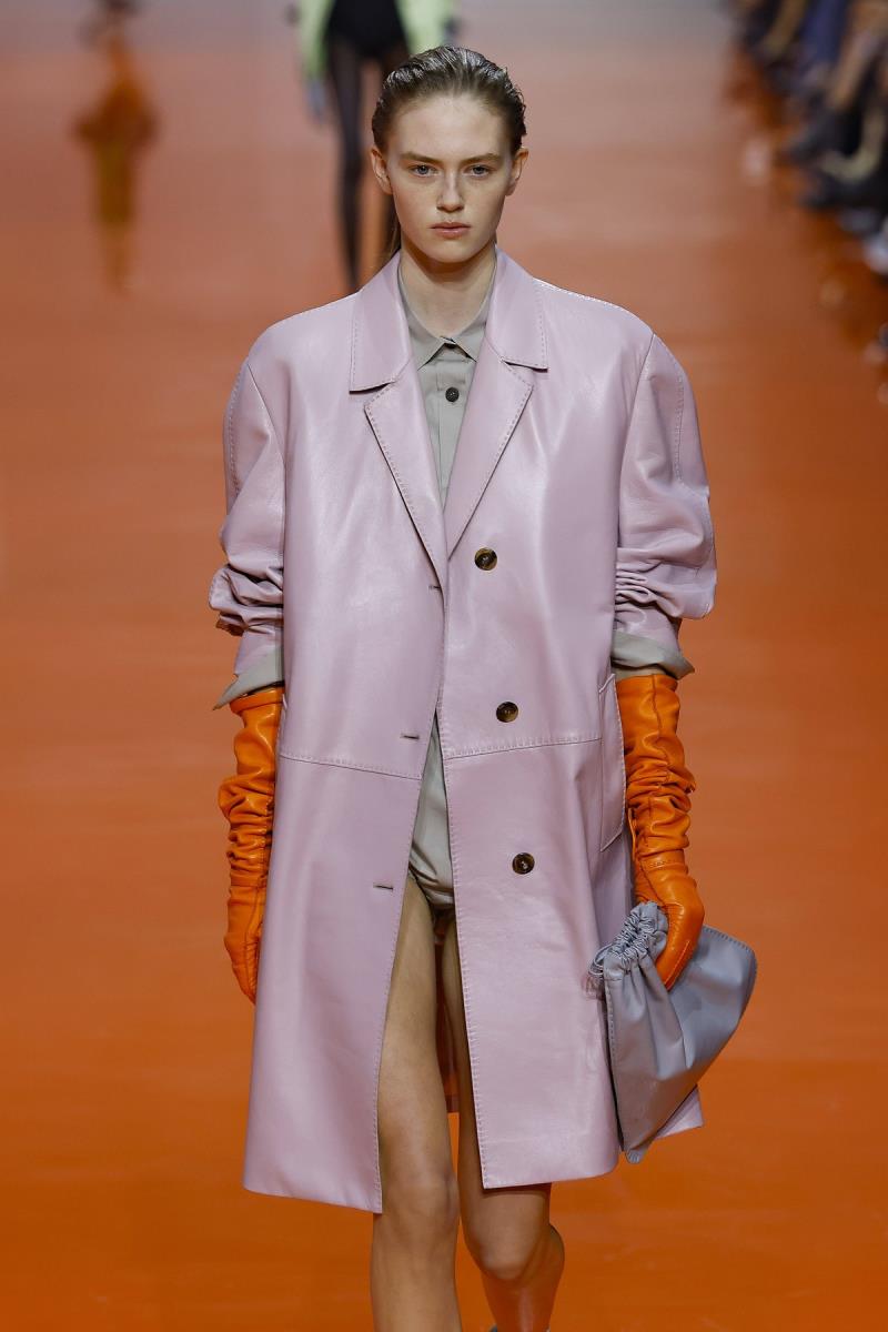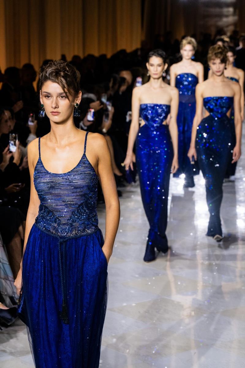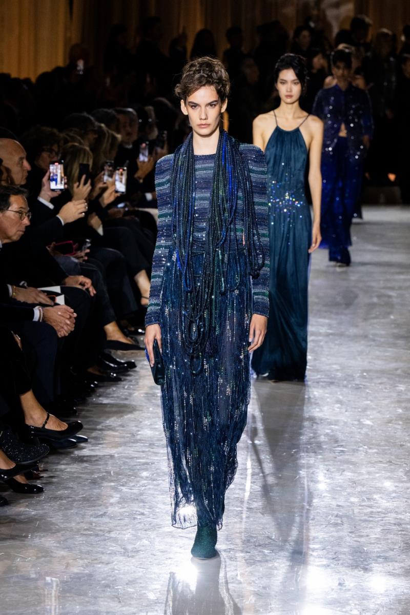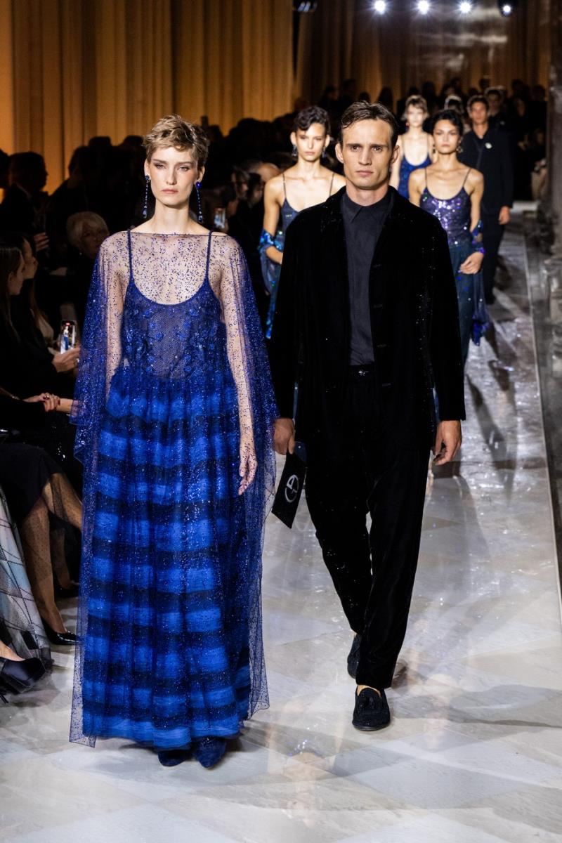 На пистата се редеа строги кроеви: предимензионирани палта, кошули со високи јаки и варијации на вечерни костуми, со вибрантни фустани и здолништа исткаени од илјадници сјајни нишки.