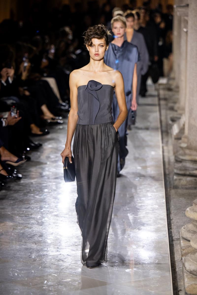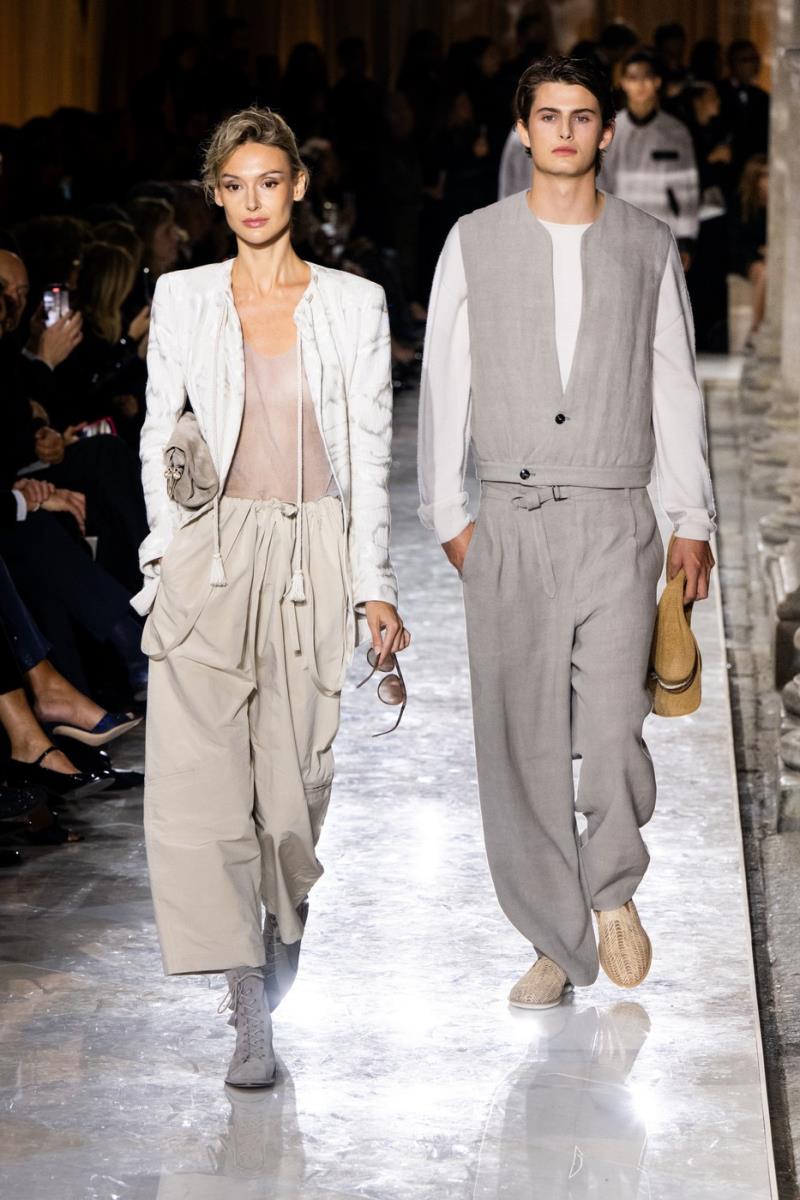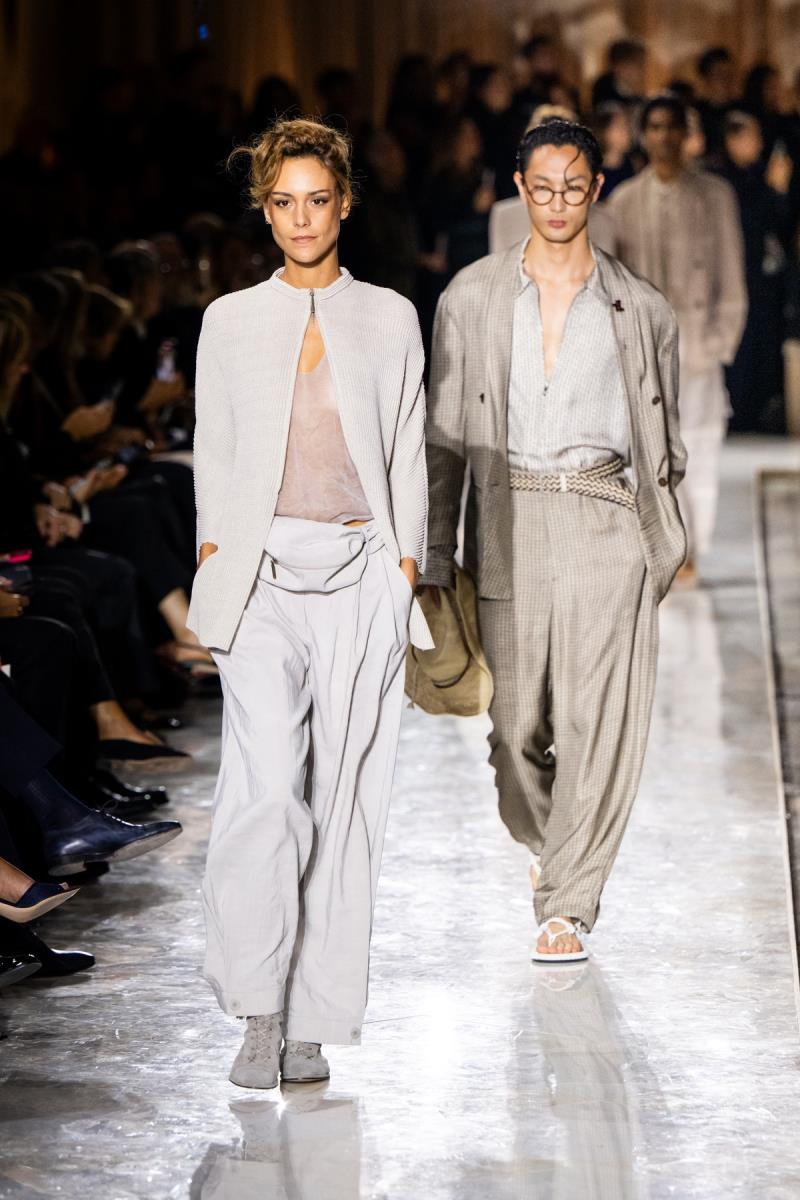 На пистата се нижеа модели во класичен Армани стил: лежерни кроеви на сакоа, широки панталони што го следат движењето, туники, елеци и меки ткаенини кои делуваат како продолжение на телото. Палетата на бои се движеше од тонови на песок и беж нијанси до суптилни премини на сина и зелена, создавајќи атмосфера на мирна, речиси медитеранска леснотија.