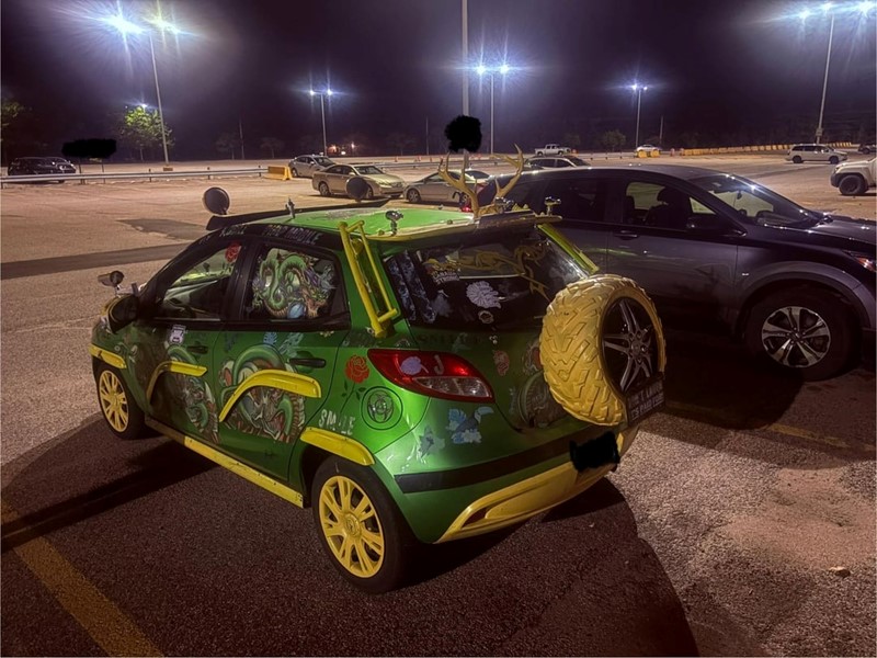 Кога некој ќе каже дека „автомобилот мора да има карактер“, таа изјава може да се протолкува на различни начини. Но сопственикот на зелениот „змеј“, снимен неодамна на едно паркиралиште, ја сфатил буквално. Опремена со рогови, жолти тркала, бројни „украсни“ детали и дополнителни гуми поставени напред и назад, неговата (или нејзината) мала „Mazda“ успева истовремено да ги насмее и да ги исплаши минувачите.