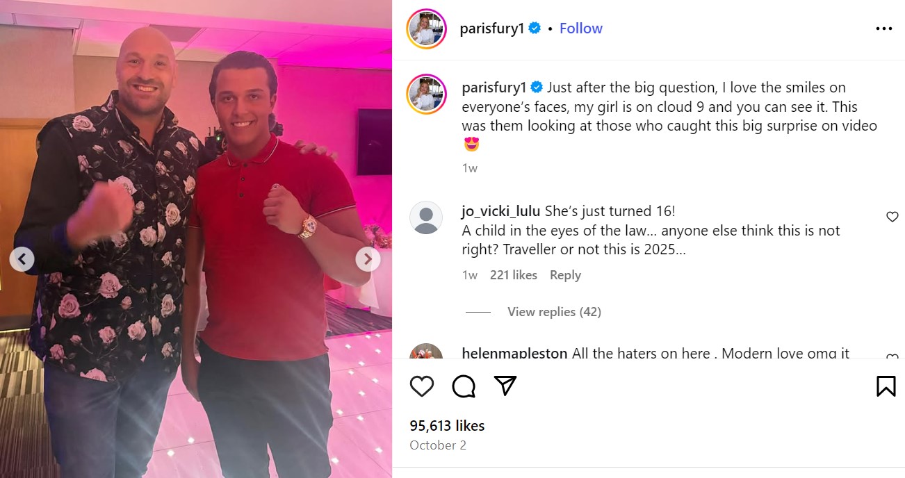 Парис, сопругата на боксерскиот шампион, Тајсон Фјури, сега ја потврди својата поддршка во ново интервју за „Мирор“, велејќи дека семејството е „многу среќно за неа“. Таа призна дека нејзината ќерка е млада, но нагласи дека оваа пресвртница е „во согласност со нашите традиции и вредности“.
