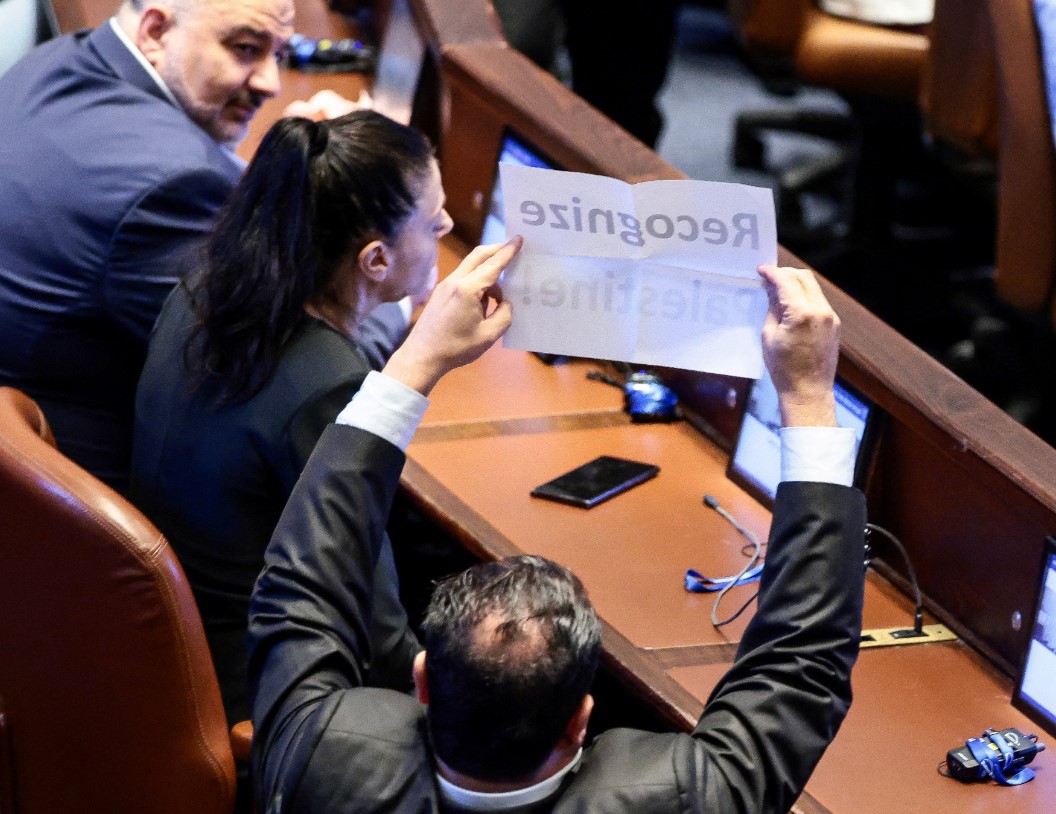 Инаку Касиф и Одех држеле листови на кои пишувало „признајте ја Палестина“ пред да бидат насилно отстранети од салата од страна на обезбедувањето.