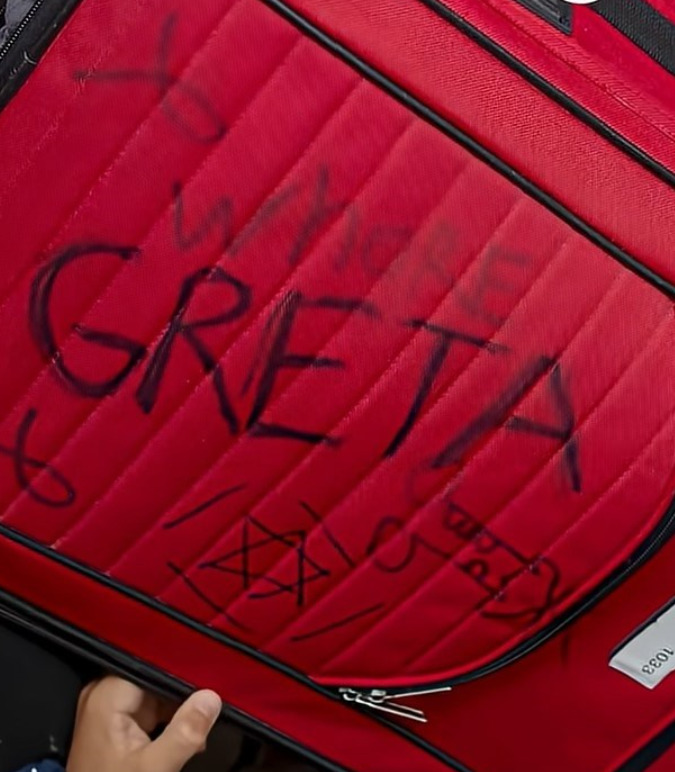 „Во ходникот лежи нејзиниот куфер. Некој напишал „Whore Greta“ (Грета ку*ва) на него со црн маркер. Натписот е опкружен со израелско знаме и пенис. Куферот бил конфискуван од израелската армија и ѝ бил вратен на Грета Тунберг каков што бил“. „Се однесуваат како петгодишни деца“, вели шведската активистка со смеа на почетокот на интервјуто за шведскиот дневен весник „Афтонбладет“.