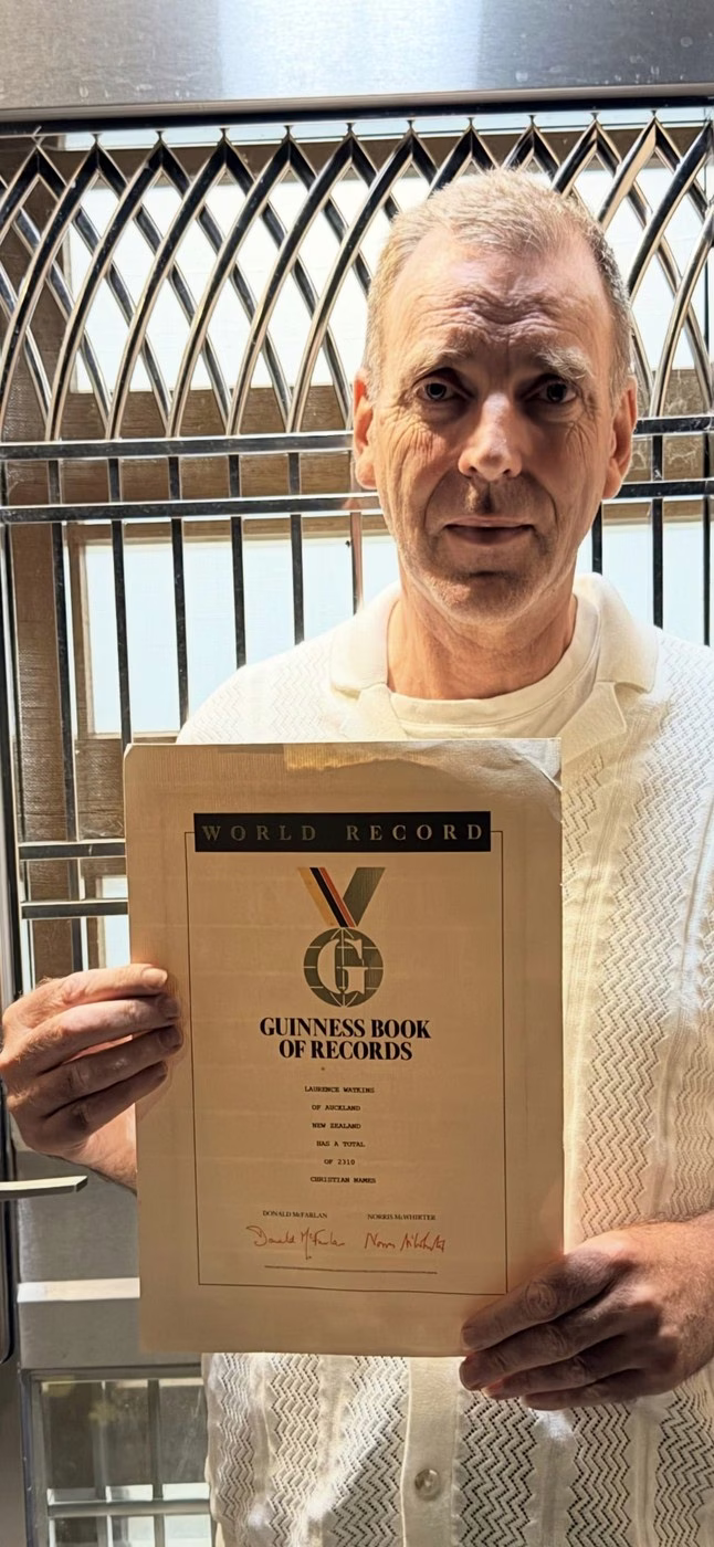 60-годишниот пензиониран вооружен обезбедувач од Окленд, Нов Зеланд, го држи светскиот рекорд за најдолго лично име, титула што неодамна му ја додели Гинисовата книга на рекорди при рекласифицирањето на неговиот оригинален рекорд за најдолго христијанско име, одобрен во 1992 година.