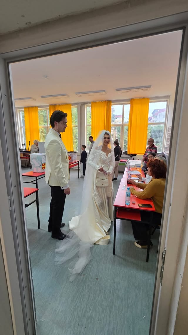 Во една несекојдневна сцена за изборните денови, невестата Сандра Матеска од Скопје, вчера облечена во венчаница и во придружба на младоженецот го искористи своето гласачко право пред да продолжи со свадбената прослава.