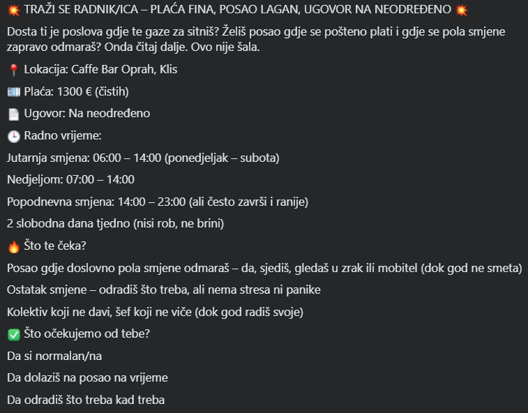 „Доста ти е од работи каде што те газат за ситни пари? Сакаш работа каде што си чесно платен и каде што половина смена, реално, одмараш? Продолжи да читаш. Ова не е шега.