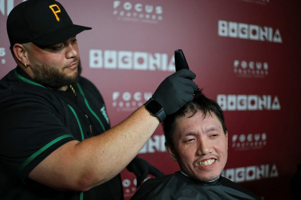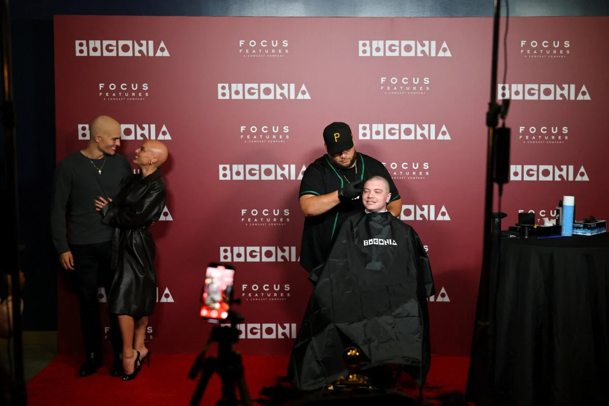 Десетици храбри гледачи стоеле во ред за да си ги избричат главите и да влезат на рана проекција на филмот „Bugonia“ во Лос Анџелес, како омаж на ќелавиот главен лик кој го толкува актерката Ема Стоун.