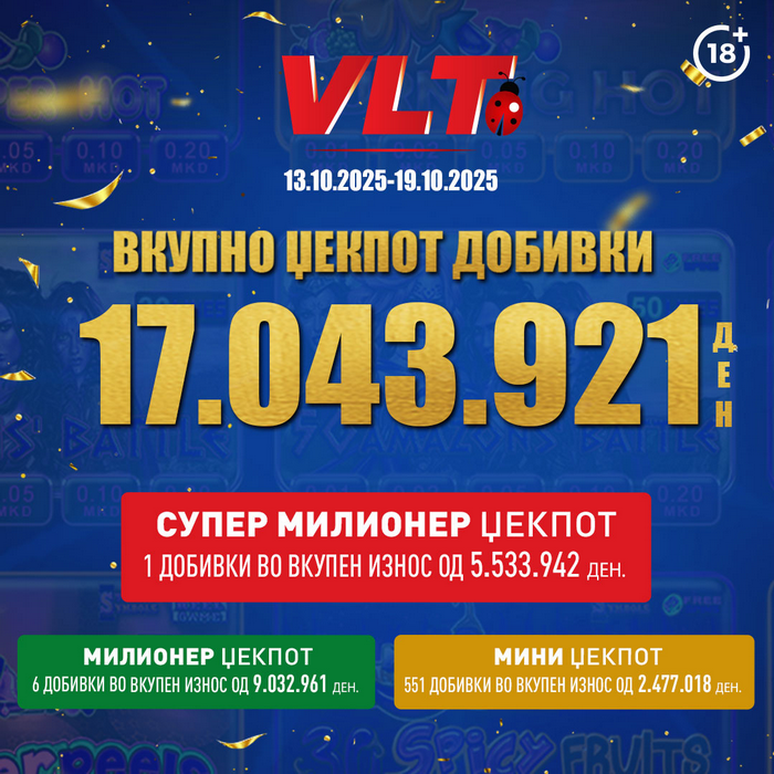 Во периодот од 13.10.2025 до 19.10.2025 Видеолотарија Касинос Австрија исплати фантастични 17.043.921денари кон играчите на ВЛТ терминалите ширум Македонија и тоа: