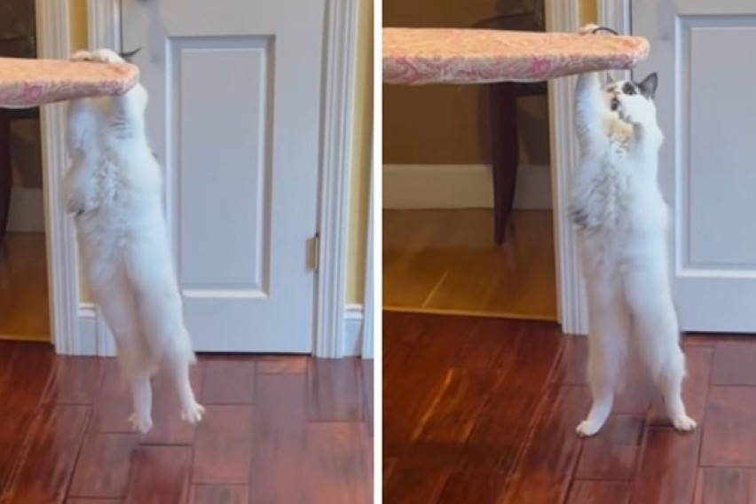 Снимката, која првично беше објавена на ТикТок од корисничката @yoouuulie, прикажува долговлакнеста мачка која со предните шепи се држи за даска за пеглање како да станува збор за гимнастичка пречка. Потоа, мачката се ниша напред-назад, како да се подготвува за Олимписките игри.