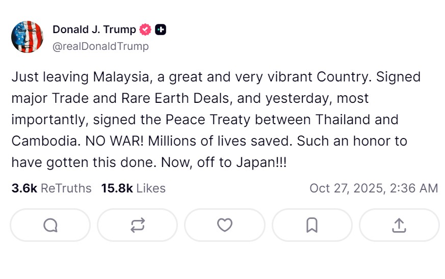 „Тукушто ја напуштам Малезија, одлична и многу динамична земја. Потпишавме големи трговски договори, договори за ретки метали и вчера, најважно, мировен договор меѓу Тајланд и Камбоџа. НЕМА ВОЈНА! Милиони животи се спасени“, напиша Трамп на Truth Social кратко пред неговото заминување.