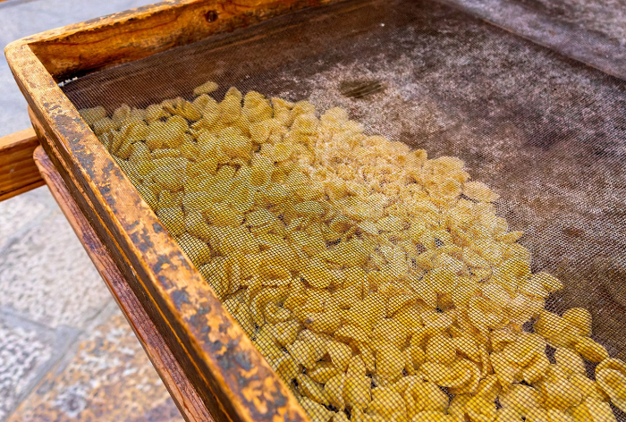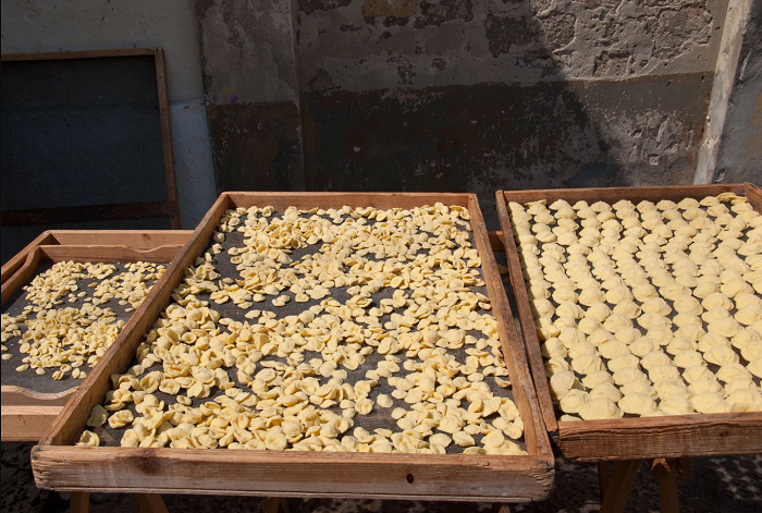 Дрвени табли поставени на праговите на куќите, тацни полни со свежо тесто што се суши на благиот медитерански ветар, мирисот на пченично брашно и пријателскиот џагор— сето тоа создава атмосфера на автентична, жива разгледница од Апулија.
