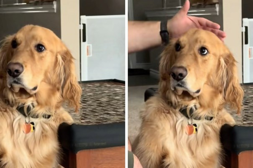 „Мојот сопруг се преправа дека го гали нашиот златен ретривер“, стои во описот на видеото. Откако е објавено, видеото доби повеќе од 3,4 милиони прегледи и над 358.000 лајкови, а илјадници корисници оставиле коментари полни со смеа и сочувство кон збунетото куче.