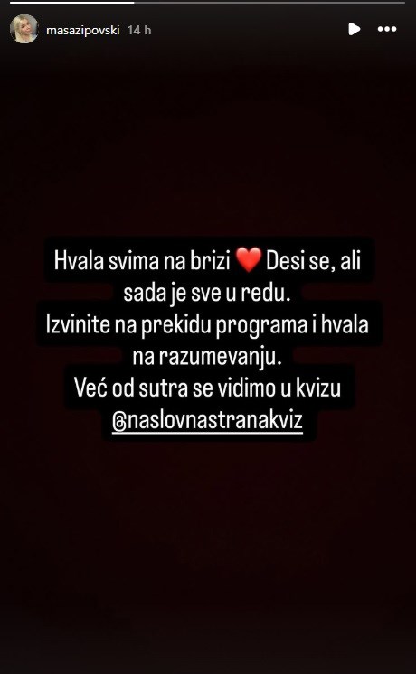 „Ви благодарам на сите за грижата. Се случува, но сега сè е во ред. Извинете за прекинатата програма и благодарам на разбирањето. Веќе од утре се гледаме“, напишала водителката на Инстаграм.