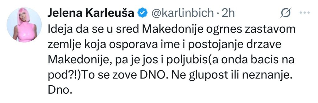 Пејачката Јелена Карлеуша реагираше по настапот на Светлана Цеца Ражнатовиќ во Велес, каде што Цеца се завитка во бугарското знаме, потег што предизвика негодување кај публиката.
