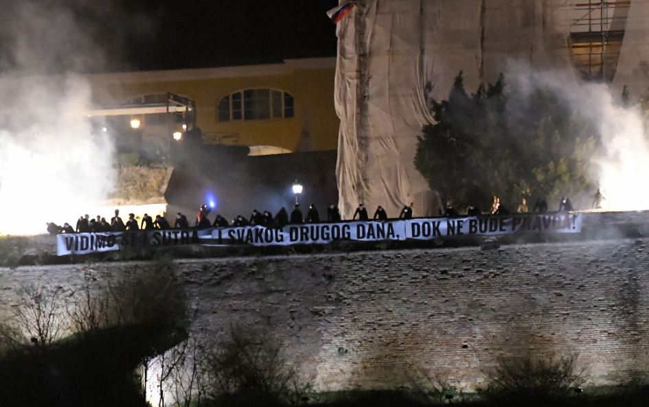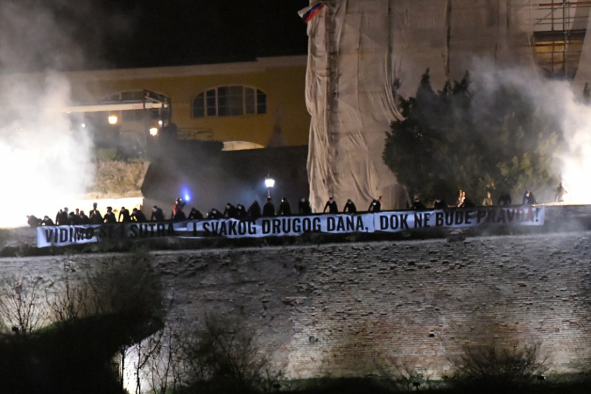 Се гледам утре и секој ден, додека нема правда – ова е пораката на транспарентот кој студентите го спуштија на Петроварадинската тврдина на крајот од големиот комеморативен собир за 16-те жртви на трагедијата кога пред една година се урна настрешницата на железничката станица.