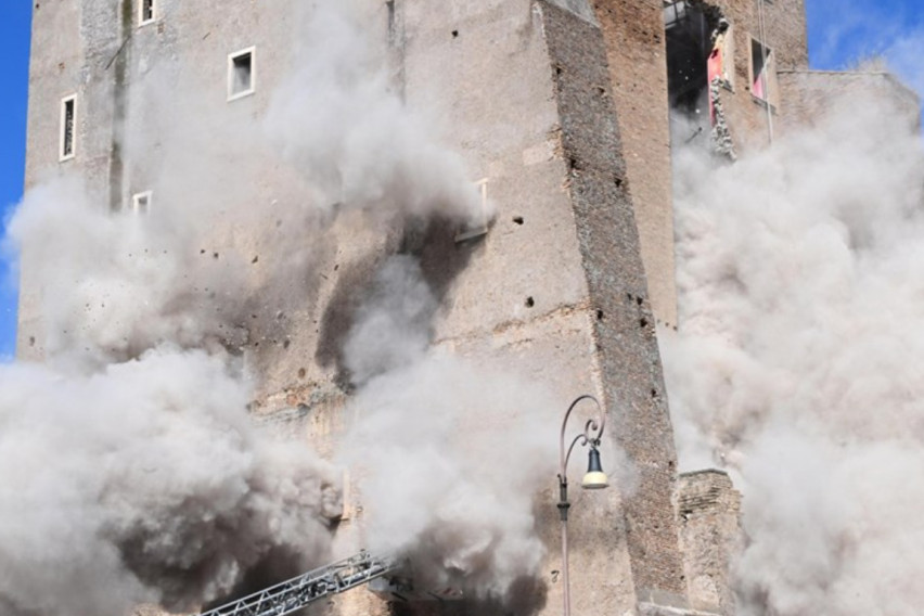 Дел од фасадата на кулата, која се наоѓа во близина на Царскиот форум и Колосеумот, се урна во понеделник наутро, создавајќи облак од прашина и закопувајќи ги работниците на местото. Според извештаите на медиумите, тројца работници биле евакуирани, додека еден претрпел повреда на главата. Последниот, 66-годишен романски државјанин, останал заробен под урнатините повеќе од 11 часа.
