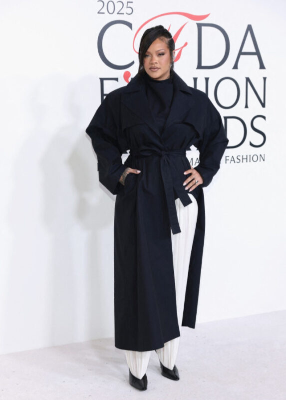 Ријана избра бели плисирани панталони кои ги комбинираше со црн топ, додека преку сè носеше асиметричен капут и го зачини своето екстравагантно издание. Интересно е што панталоните беа вметнати во црни чевли, па пејачката повторно ја покажа целата своја оригиналност.
