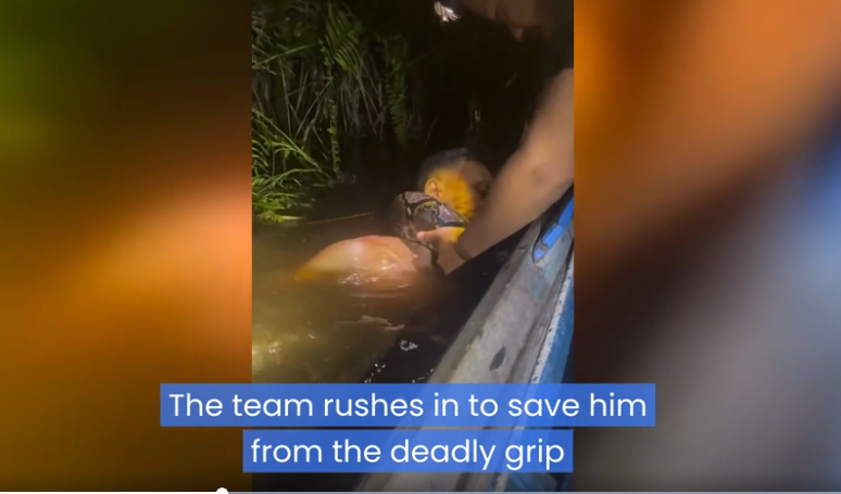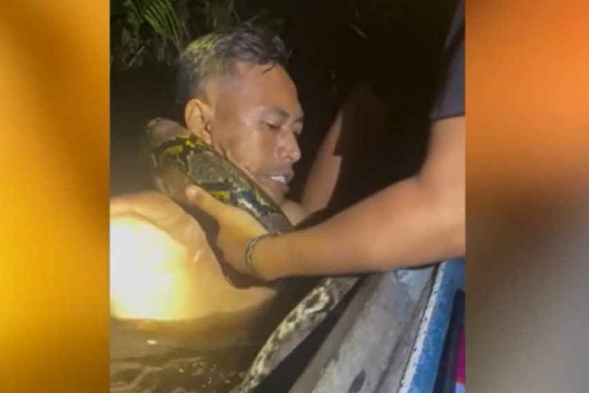 Вистински хорор на река во Индонезија — туристичкиот водич Херу за малку избегнал смрт кога питон долг шест метри го повлекол од чамецот и му се обвил околу вратот.