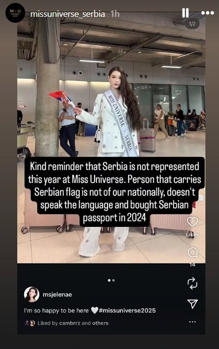„Љубезно потсетување дека Србија годинава нема претставничка на ‘Miss Universe’. Лицето што го носи српското знаме не е од нашата националност, не го зборува јазикот и купи српски пасош во 2024 година“, напишаа од организацијата.