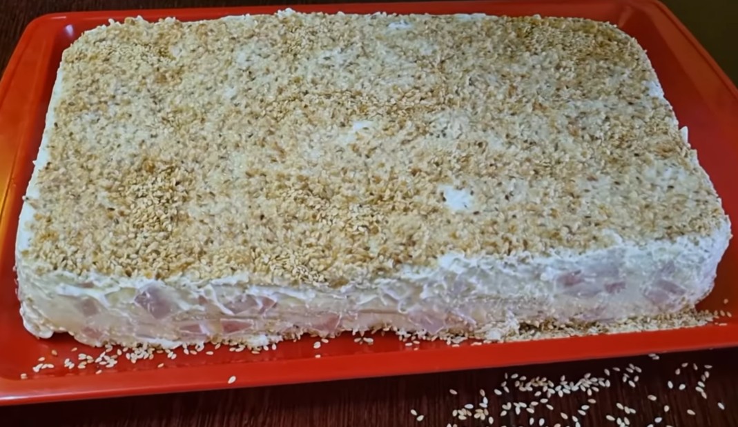 Во продолжение рецепт за сусам-торта односно верзија со шунка, кашкавал, мајонез и павлака, кој овозможува совршена рамнотежа на вкус и текстура. Иако тортата е претежно кремаста, пржениот сусам ѝ дава посебен мирис и крцкавост.