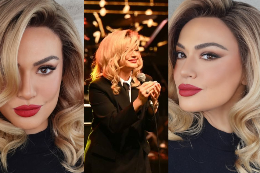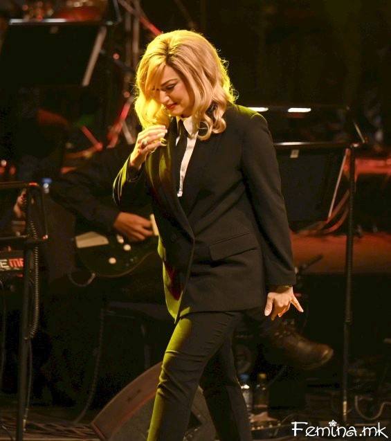 Контрастот меѓу строгата, класична облека и меката руса коса создаде визуелна рамнотежа која веднаш го привлече вниманието. Шминката е прецизно изведена, со нагласени очи и уредно обликувани усни, што го заокружува нејзиниот нов сценски израз.