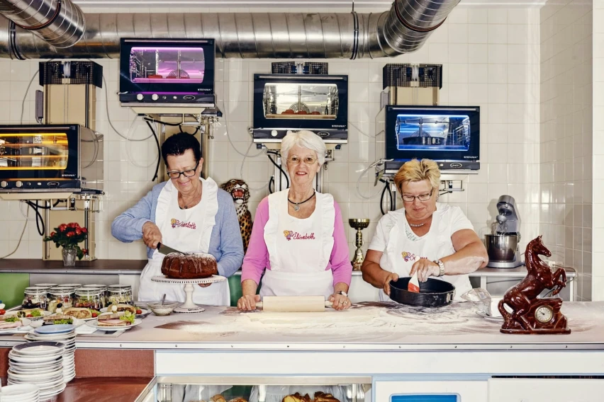 Една од бабите што работат во „Vollpension“ е Катрин, поранешна медицинска сестра, која е воодушевена од слаткарските вештини што ги демонстрирале виенските дедовци, пренесе порталот „Eater“. Тука се и Беата, која пропатувала низ целиот свет во 1950-тите, Кристин, експертка за вегански колачи и поранешната актерка, Шарлот, мајсторица за Сахер тортата…