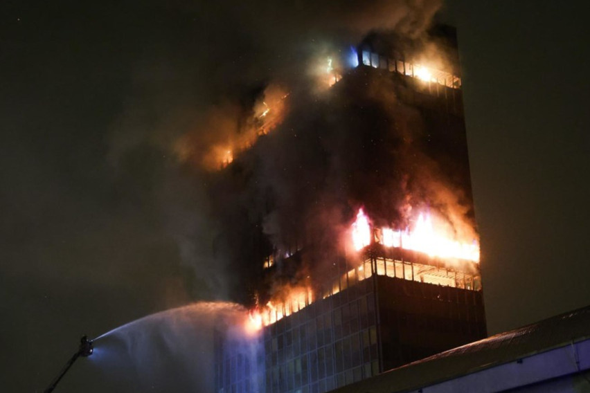 Облакодерот во Загреб, каде вчера избувна пожар малку пред полноќ, утрово сè уште гори, делови од фасадата паѓаат, а загрепските пожарникари цела ноќ се борат со пожарот. Се проценува дека ќе биде потребен цел ден за да се изгасне.