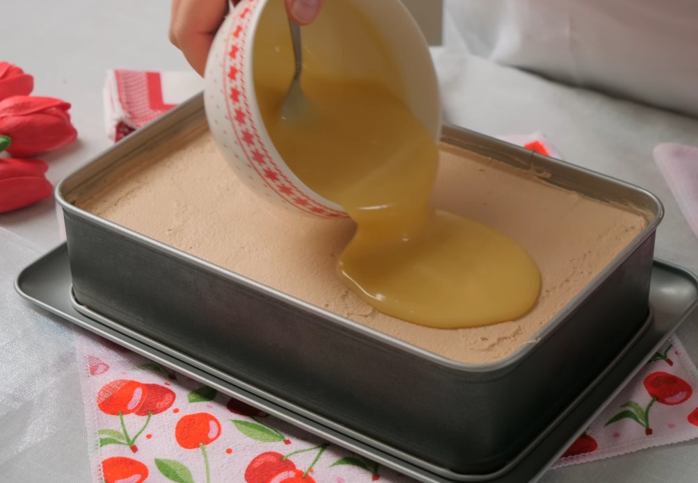 Во помал плех (30 × 20 см), ставете го првиот слој бисквити, претходно потопени во млеко или сок.