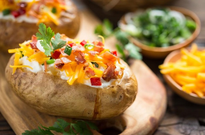 Наполнете ги половинките компири со подготвениот фил, наросете со преостанатиот кашкавал и печете уште 10-15 минути додека кашкавалот не се стопи и не добие златно-кафена боја.