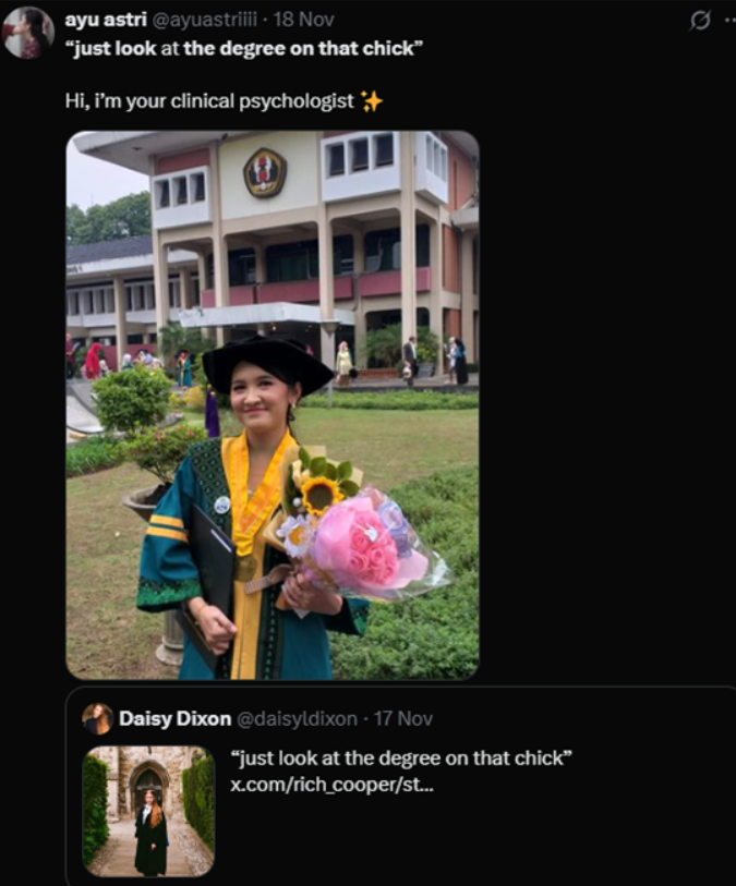Но, тој не очекувал дека интернетот навистина ќе застане во нејзина одбрана. Одговорите на неговиот коментар го преплавија „X“, а реченицата „Погледни ја дипломата кај таа девојка“ доби сосема поинакво значење.