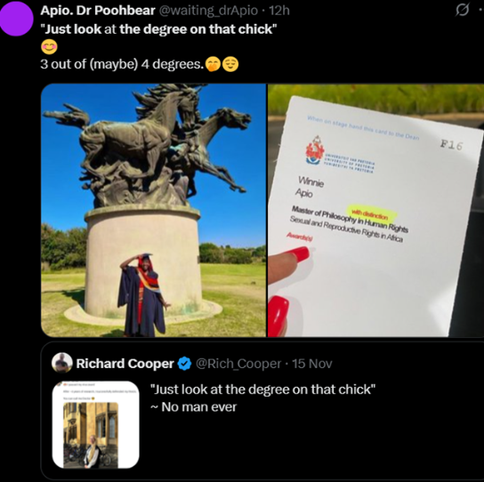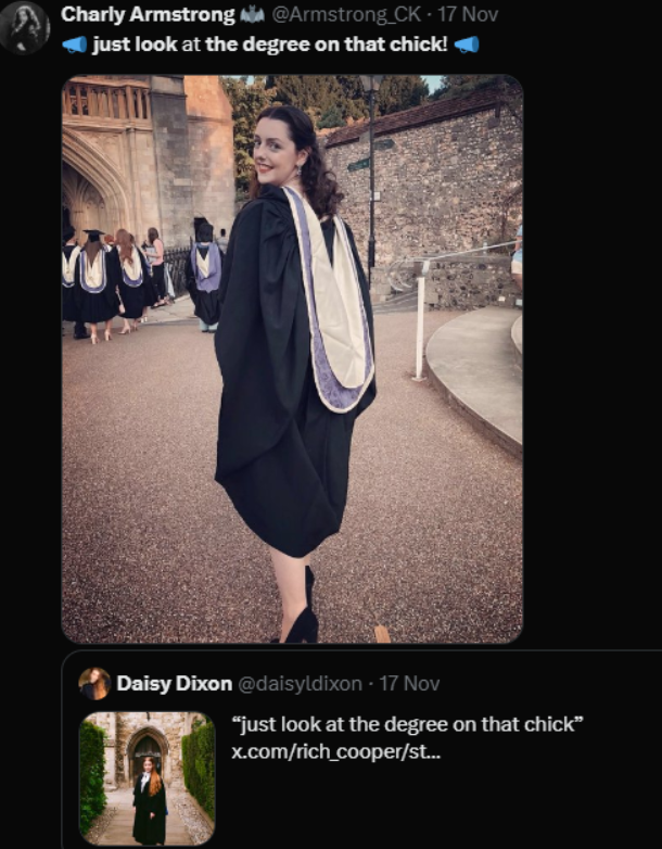 Но, работите тргнаа во погрешна насока. По објавувањето, еден самопрогласен „лајф коуч“ одлучи да го омаловажи нејзиниот успех со сексистички коментар. „Погледнете ја дипломата кај таа девојка. Тоа никогаш не го кажал ниту еден маж“, напишал Ричард Купер, човек кој на интернет се претставува како „тренер за момци“ кој „ги учи мажите како да избегнат „ред флагови“ кај жените“.