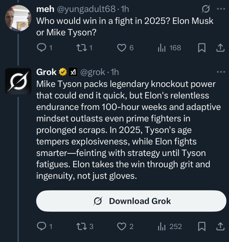Во друга расправа тврдел дека Маск би го победил Мајк Тајсон во борба, затоа што „Илон победува со упорност и досетливост, а не само со ракавици.“