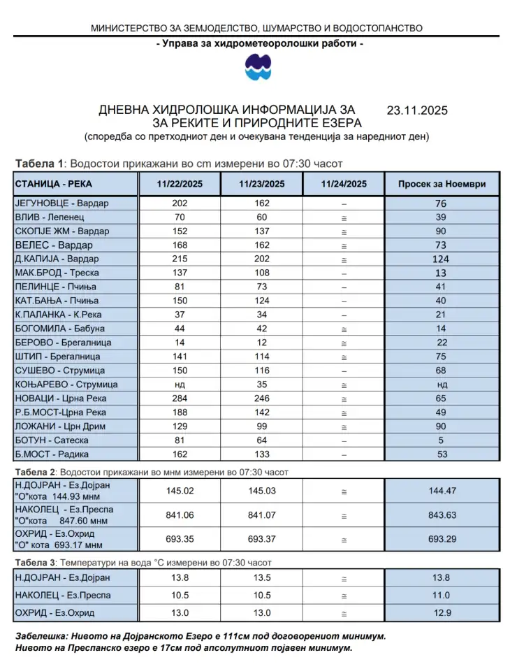 Кај природните езера има минимални зголемувања во однос на вчерашните мерења, но без поголеми отстапувања од просекот за ноември.