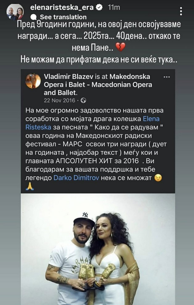 Своја приказна сподели и Елена Ристеска. Таа објави стара фотографија од нивната прва успешна соработка, кога во 2016 година заедно освоија три награди на Македонскиот радиски фестивал – МАРС.