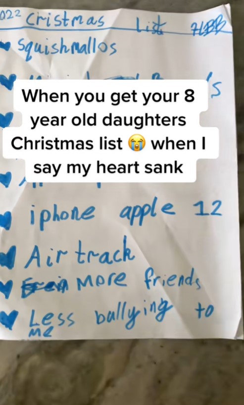 Во видео објавено на ТикТок кое трогна милиони корисници, Сузи Боливер, мајка на две деца, ја сподели листата со желби на својата осумгодишна ќерка. На почетокот, листата изгледала сосема нормално за нејзините години: кадифени играчки, розов „iPad mini“ и нови шарени моливи.