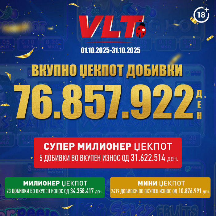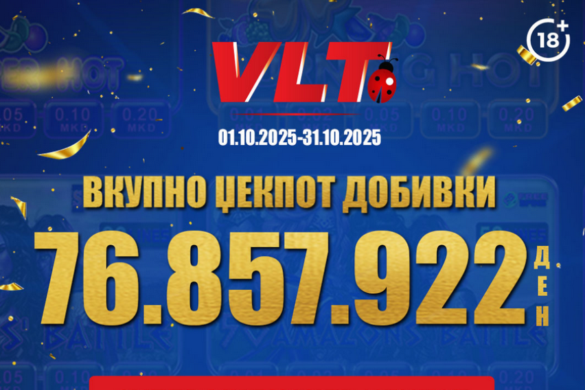 Октомври уште еднаш покажа дека среќата е со ВЛТ. Видеолотарија Касинос Австрија им исплати фантастични 76.857.922 денари (околу 1.250.000 евра) на своите играчи на ВЛТ терминалите ширум Македонија во перидот од 01.101.2025 до 31.10.2025. Овие бројки се убав доказ за илјадници нови среќни приказни!