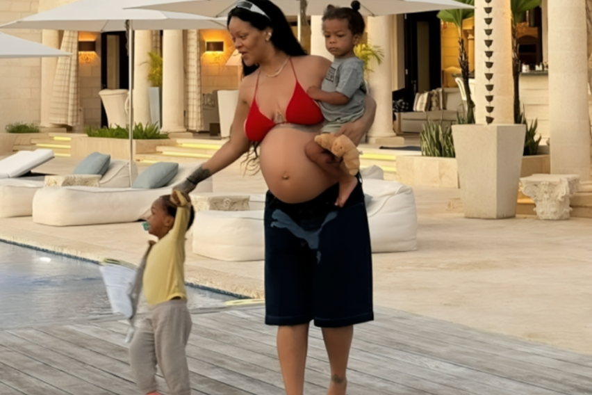 Ријана исто така споделила фотографија на која гордо го покажува трудничкиот стомак во бикини на балкон со поглед кон океанот. На уште една емотивна снимка, таа шета покрај базенот држејќи го РЗА за рака и носејќи го двегодишниот Риот, исто така истакнувајќи го стомакот во кратки панталони и горен дел од костимот за капење.