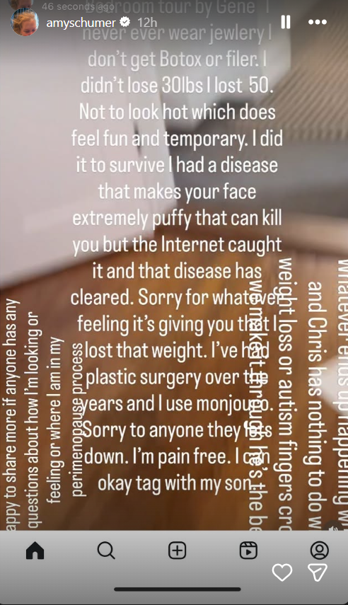 „Жалам за било какво чувство што ви го дава тоа што ја изгубив таа тежина“, продолжила Шумер, повторувајќи дека во текот на годините имала пластични операции и дека користи лек Мунјаро. „Жалам за секого кого тоа го разочара.“