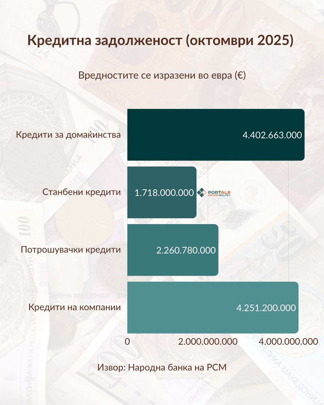 Вкупната кредитна задолженост на домаќинствата надмина 4,4 милијарди евра пишува Порталб. На крајот на октомври компаниите пак во банките биле задолжени со 4,2 милијарди евра. Банкарите навестуваат можно заострување на кредитните услови.