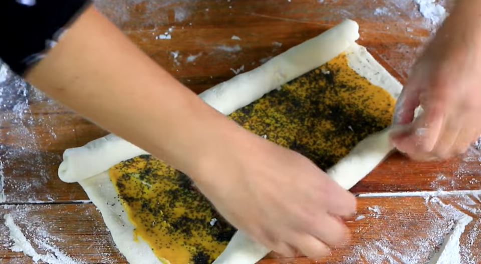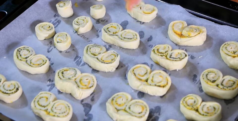 Развлечете го тестото, премачкајте го со сенф, наросете со семки од афион, замотајте во ролат и исечете форма на полжави. За „двоен“ ефект – спојте два полжави пред печење.