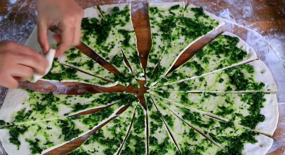 Изрендајте маргаринот врз тестото, премачкајте го со мешавина од лук и вегета, потоа исечете и обликувајте помали погачици.