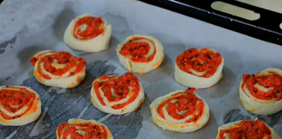 Намачкајте го растегнатото тесто со ајвар, посипете со мелена пиперка по желба, замотајте и исечете во форма на полжави.