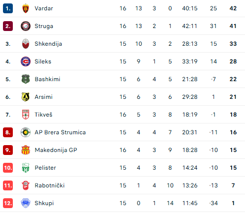 Вардар во 16 натпревари освои 42 бода, забележа 13 победи и три пати одигра нерешено. Македонија ЃП, со 15 поени се наоѓа на деветото место, во зависност од резултатот на Пелистер, може да назадува една позиција.