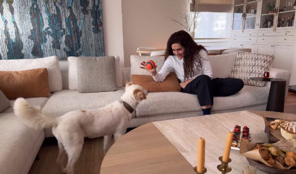 Таа избрала едноставен мебел којшто е удобен. Станот е многу добро осветлен, а ѕидовите во сите простории се целосно бели, баш како и полиците. На видеото можело да се види и нивното куче.